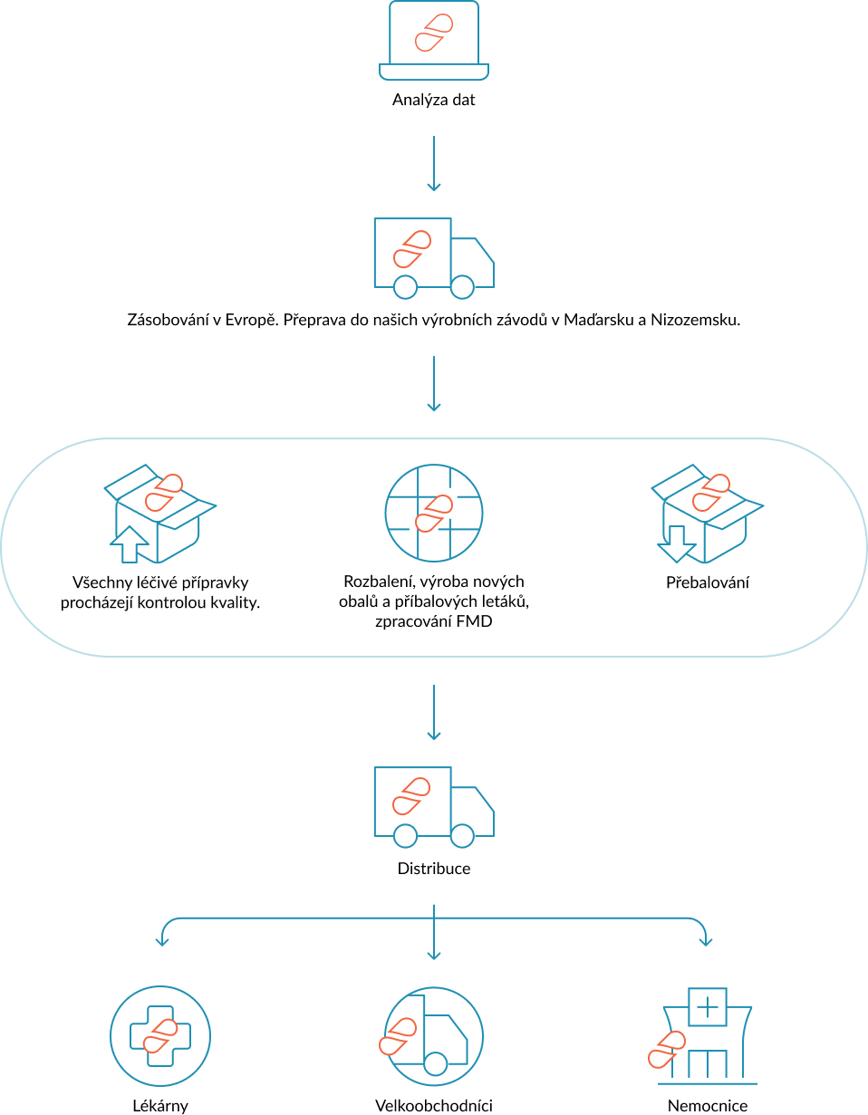 Po získání všech potřebných licencí, přidělení Národního kódu a stanovení úhrady, nakupujeme originální léčivé přípravky v některém z členských států Evropského hospodářského prostoru (EHP). Tyto přípravky jsou poté odeslány do našich výrobních zařízení, kde dochází k jejich přebalení a přelepení etiketami. Součástí tohoto procesu je také vložení příbalové informace v cílovém jazyce, aby léčivý přípravek splňoval veškeré požadavky platné národní legislativy.