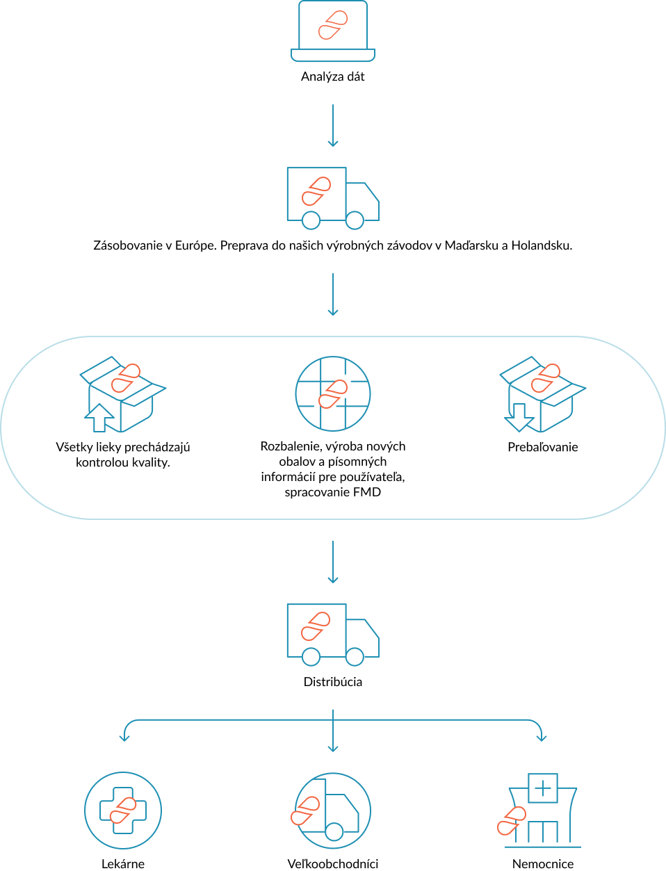 Po získaní všetkých potrebných licencií, zaevidovaní v rámci regulátora – ŠUKL SK a následnej komunikácii s Ministerstvom zdravotníctva SR ohľadom úhrady nakupujeme originálne lieky v niektorom z členských štátov Európskeho hospodárskeho priestoru (EHP). Tieto lieky sú následne odoslané do našich výrobných zariadení, kde dochádza k ich prebaleniu a prelepovaniu etiketami. Súčasťou tohto procesu je aj vloženie písomnej informácie pre používateľa v cieľovom jazyku, aby liek spĺňal všetky požiadavky platnej národnej legislatívy.